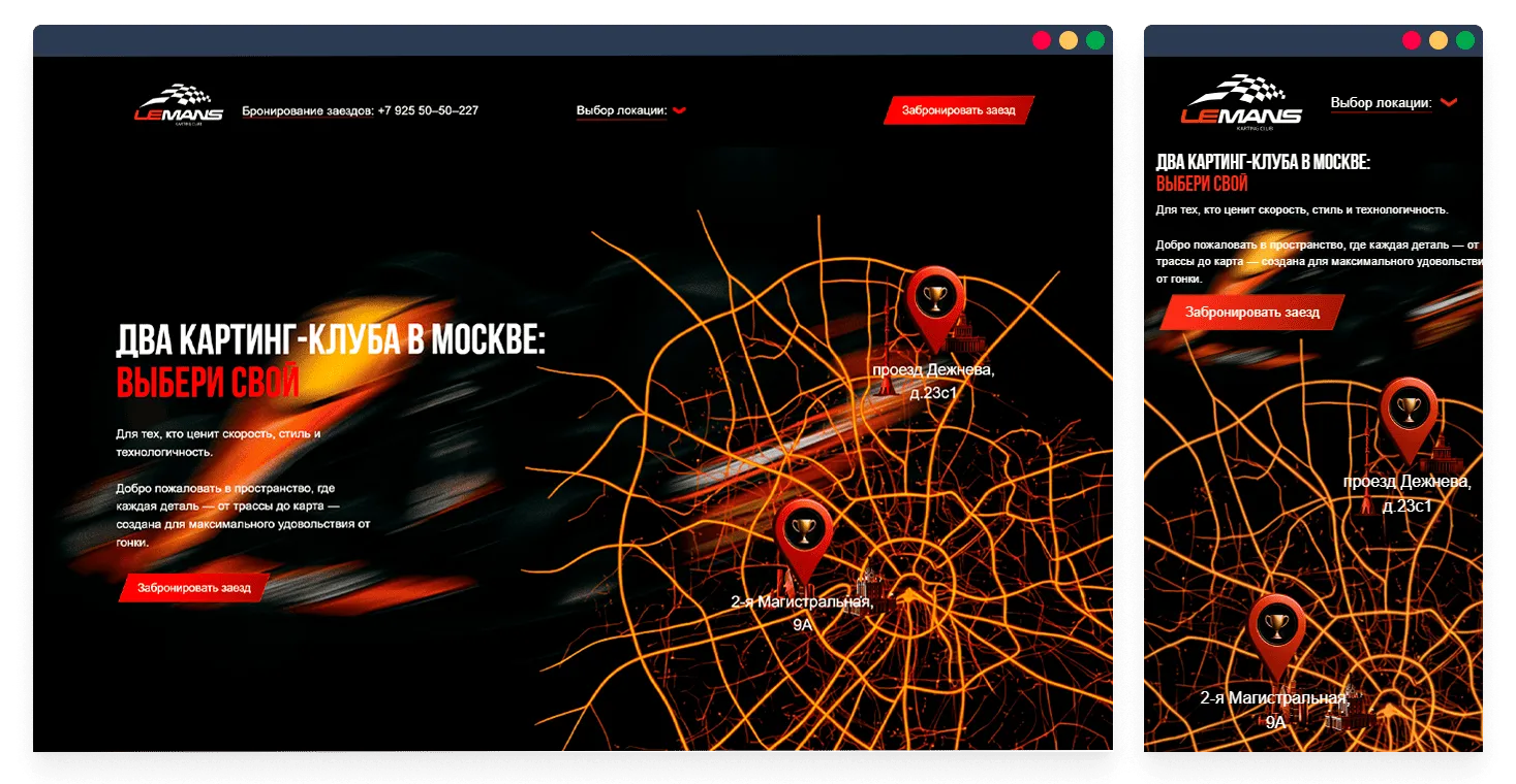 Le Mans Karting – картинг-центр, предлагающий аренду трассы, заезды и проведение корпоративных мероприятий. Компания ориентирована на частных клиентов и бизнес-аудиторию, для которых важны удобство бронирования, понятная подача услуг и современный формат взаимодействия с сайтом. При работе над проектом мы учитывали развлекательную специфику бизнеса и необходимость быстро вовлекать пользователя и подводить его к записи.